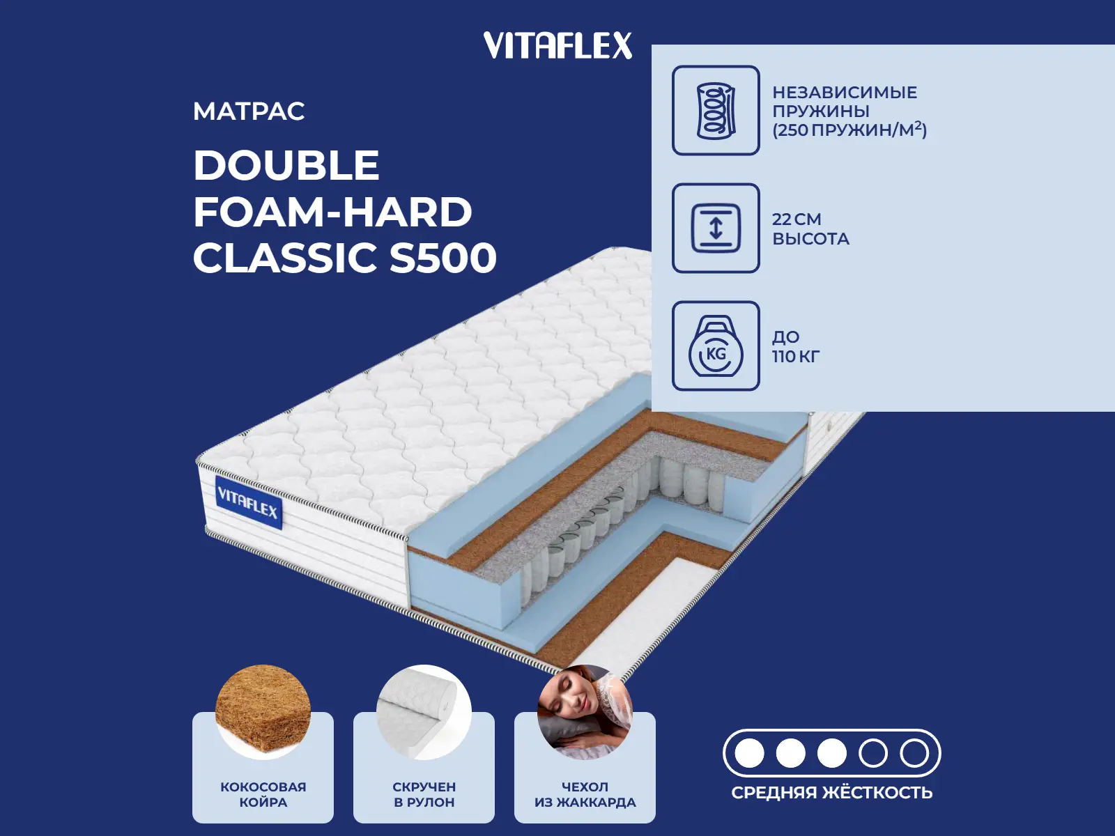 Матрас «Vitaflex Double Foam-Hard Classic S500» — средней жесткости, которая подходит большинству людей среднего телосложения. Это — универсальный выбор и детям, и взрослым, и пожилым людям.