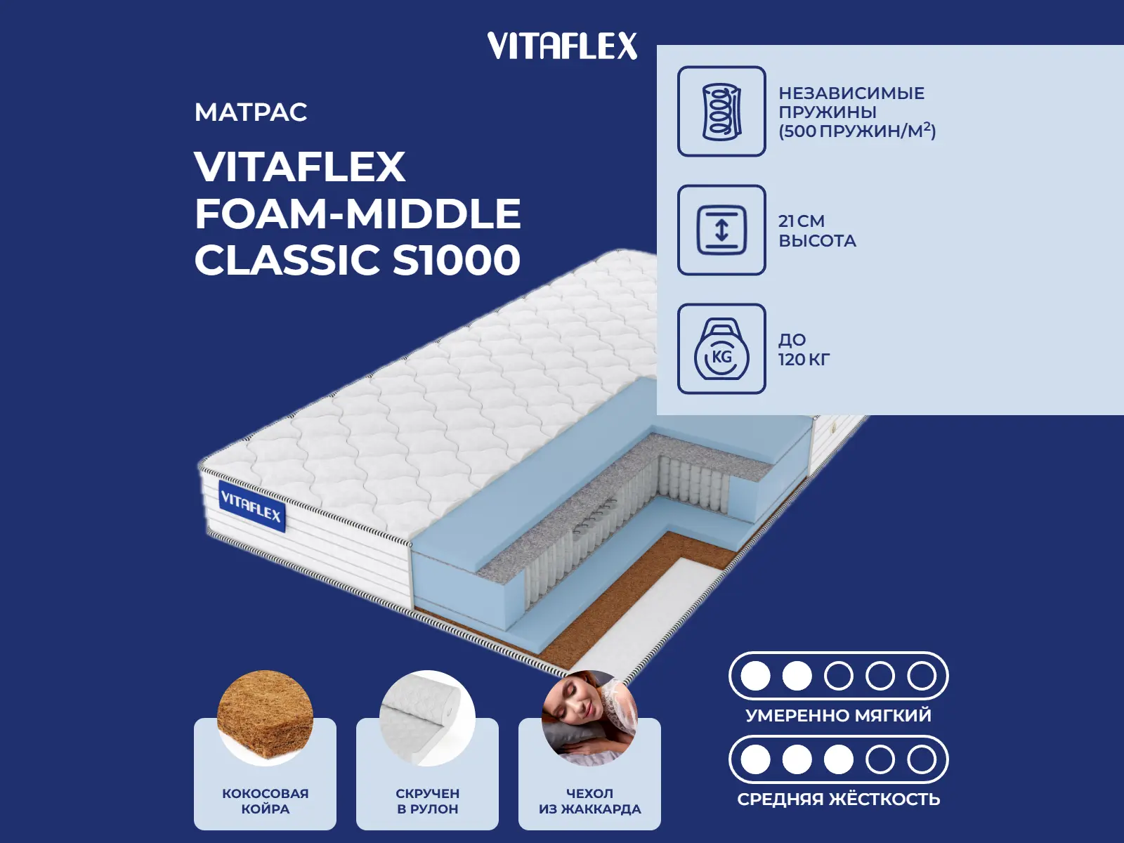 Матрас Foam-Middle Classic S1000 рассчитан на нагрузку не более 120 кг на одно спальное место.