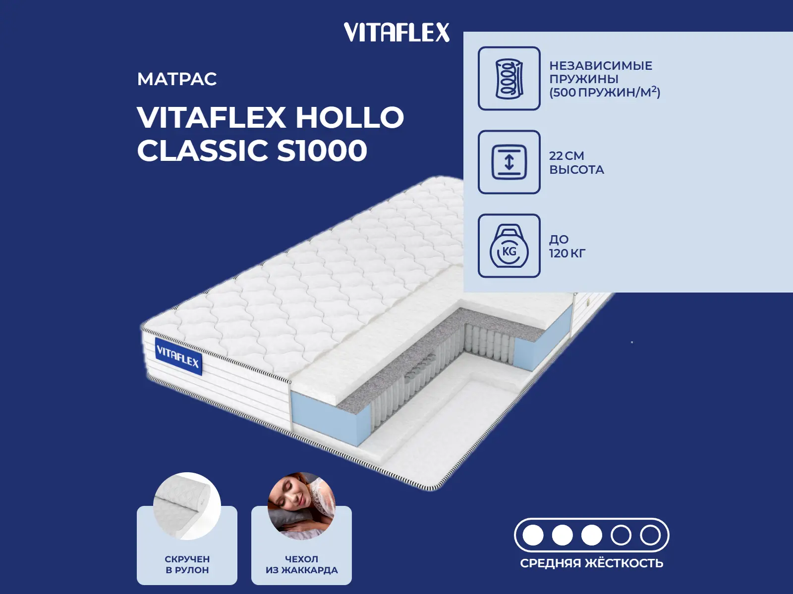 Матрас «Vitaflex Hollo Classic S1000» — средней жесткости, которая комфортна большинству людей среднего телосложения. Это — универсальный выбор и детям, и взрослым, и пожилым людям.