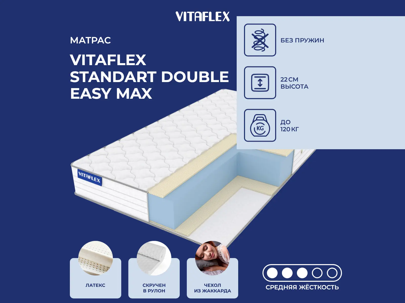 Матрас «Vitaflex Standart Double Easy Max» — средней жесткости, которая комфортна большинству людей среднего телосложения. Это — универсальный вариант и детям, и взрослым, и пожилым людям.
