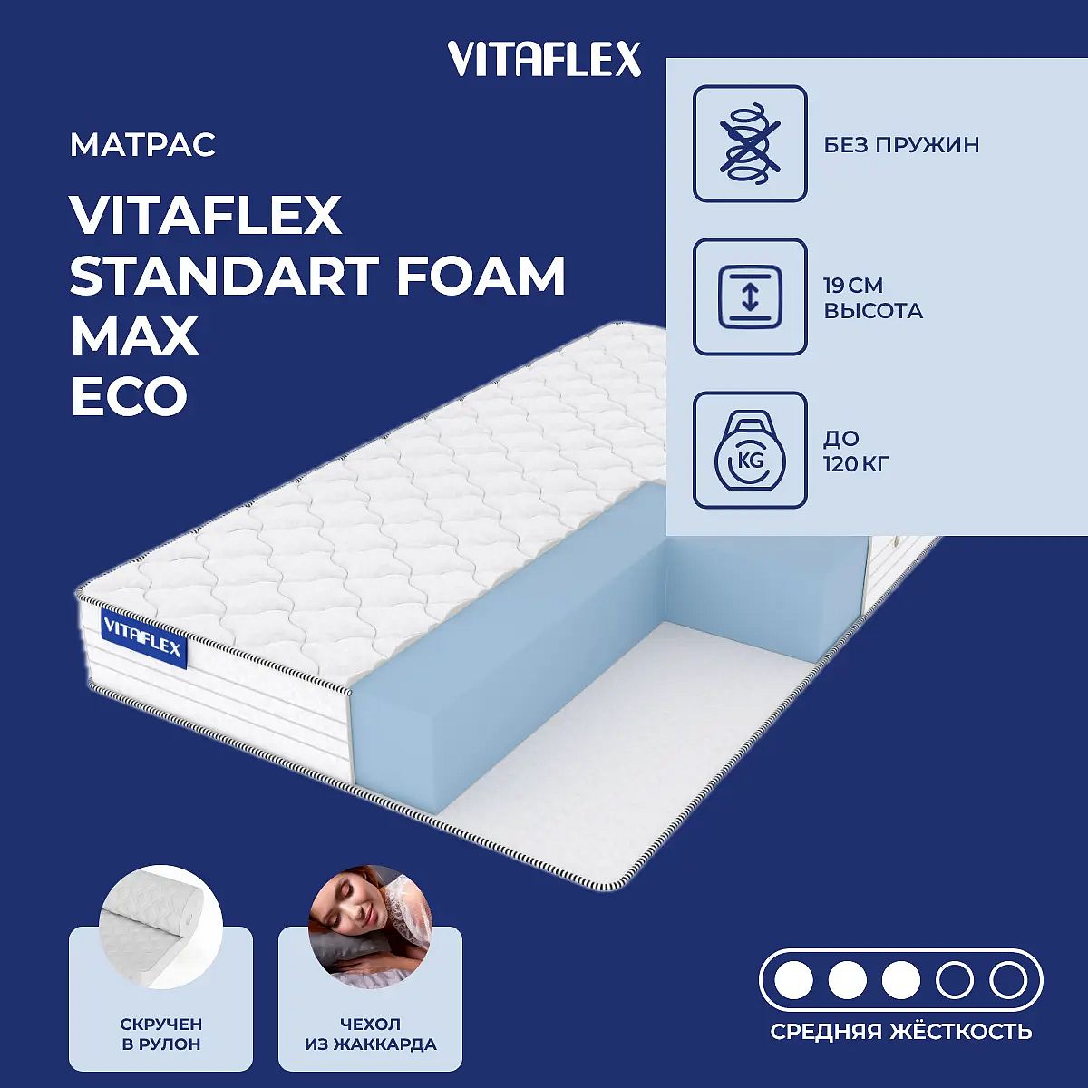 Матрас «Vitaflex Standart Foam Max Eco» — средней жесткости, которая комфортна большинству людей среднего телосложения. Это — универсальный вариант и детям, и взрослым, и пожилым людям.
