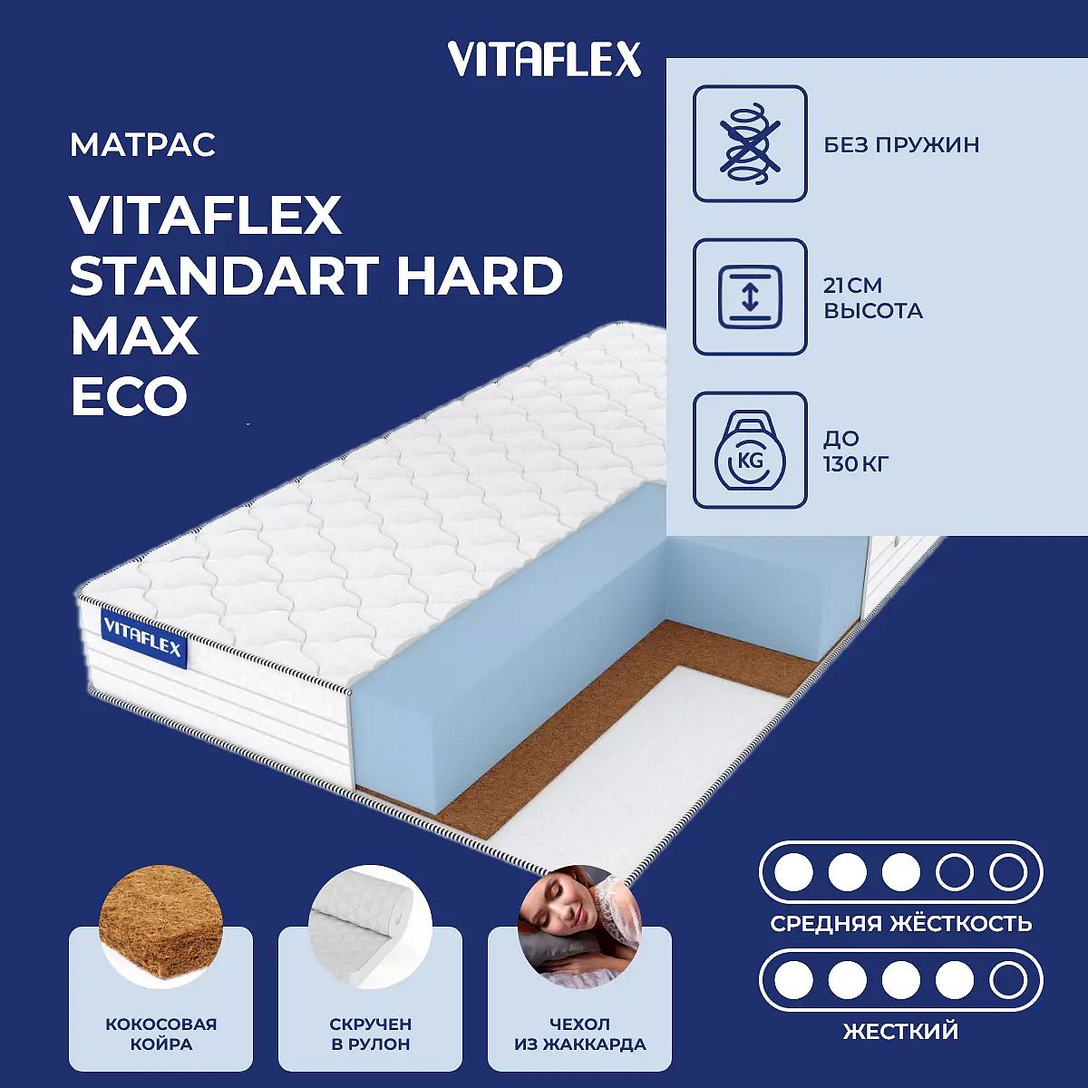 Матрас Standart Hard Max Eco рассчитан на нагрузку не более 130 кг на одно спальное место.