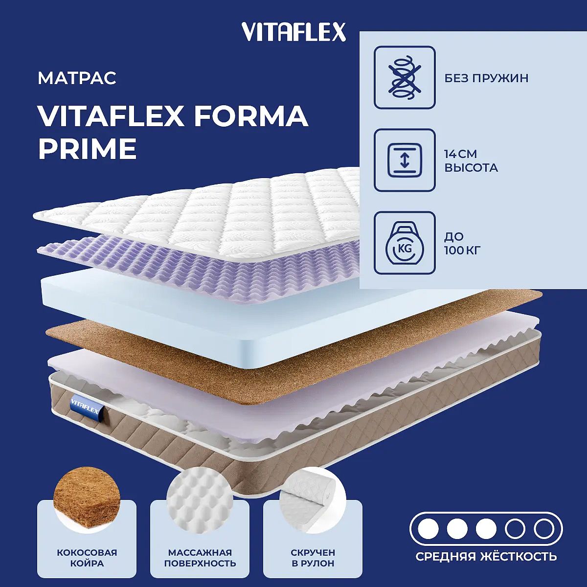 Матрас «Vitaflex Forma Prime» — средней жесткости, которая комфортна большинству людей среднего телосложения. Это — оптимальный выбор и детям, и взрослым, и пожилым людям.