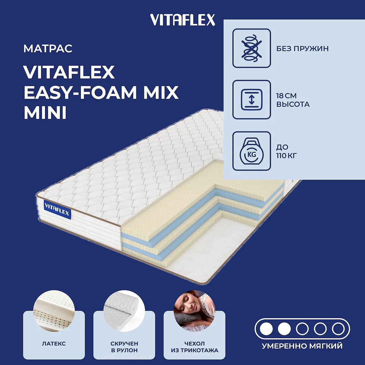 Средне-мягкий матрас «Vitaflex Easy-Foam Mix Mini» — для истинного ценителя комфорта. Такой вариант хорошо подходит людям с небольшим весом.