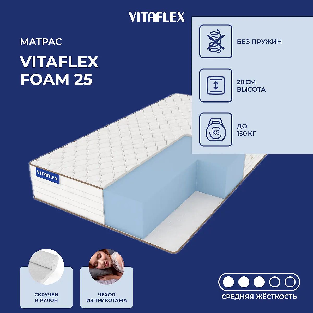 Матрас «Vitaflex Foam 25» — средней жесткости, которая подходит большинству людей среднего телосложения. Это — универсальный выбор и детям, и взрослым, и пожилым людям.