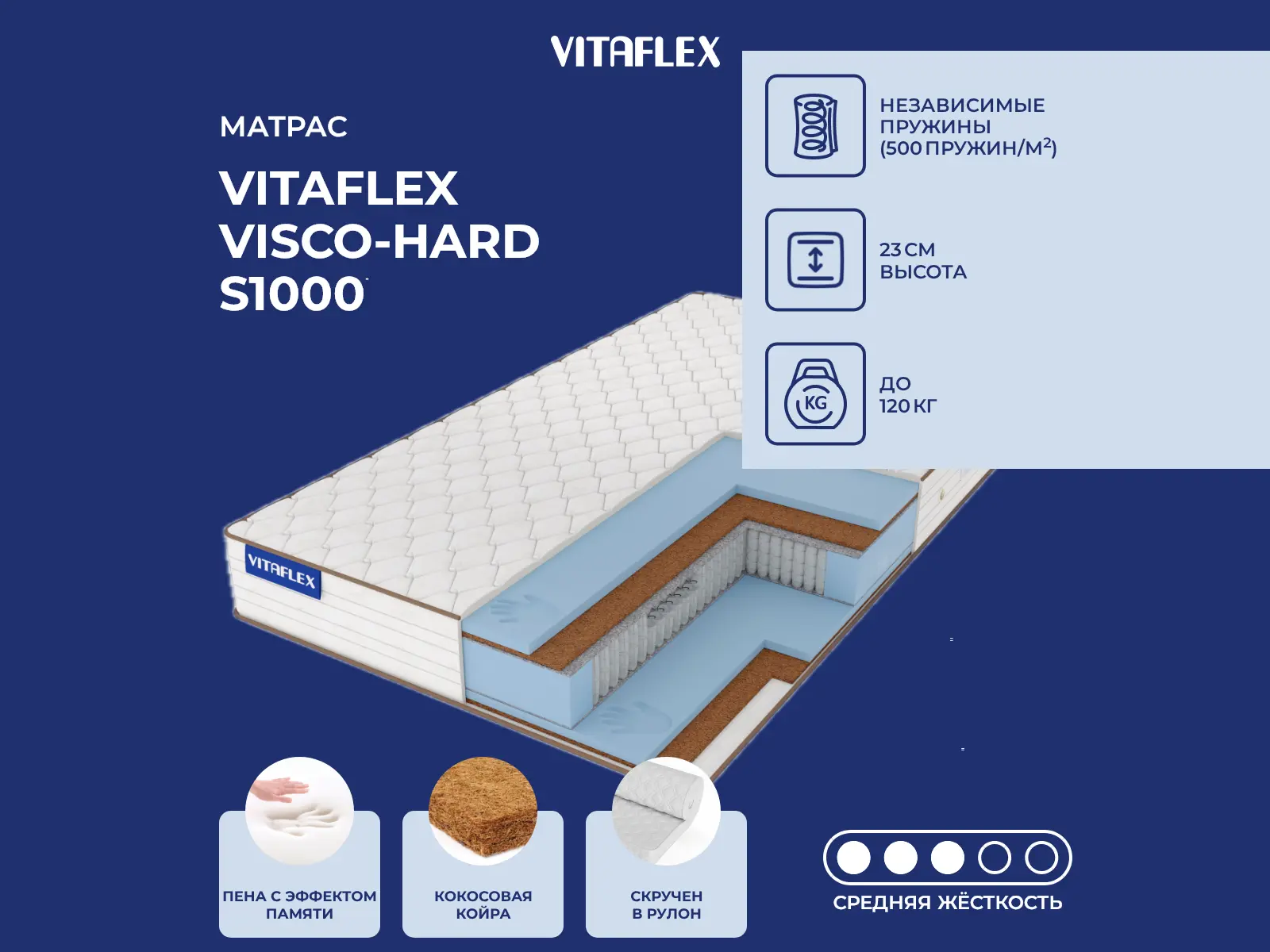 Матрас «Vitaflex Visco-Hard S1000» — средней жесткости, которая комфортна большинству людей среднего телосложения. Это — оптимальный выбор и детям, и взрослым, и пожилым людям.