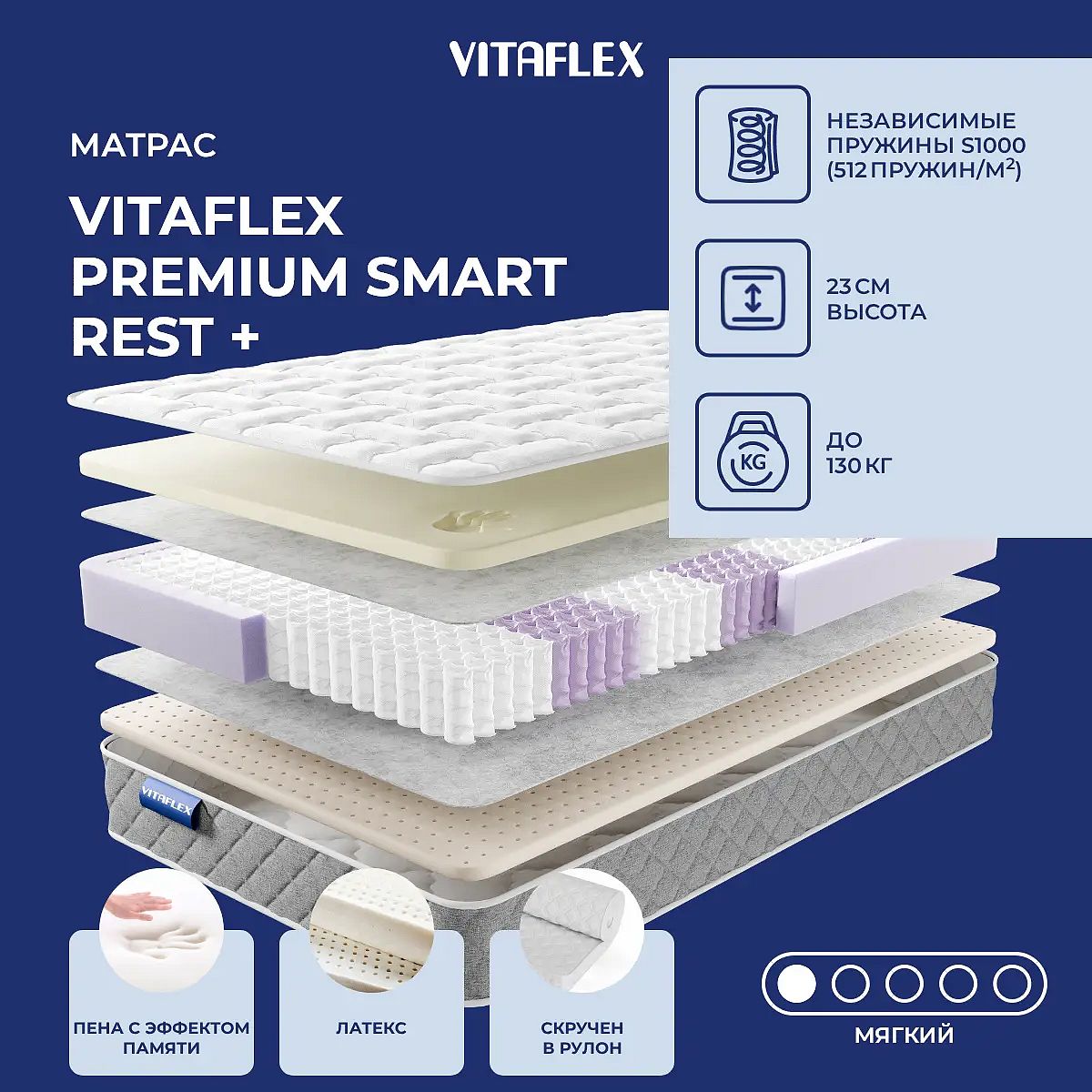 Матрас Vitaflex Premium Smart Rest + — это мягкий пружинный матрас для тех, кто ценит высокий уровень комфорта и расслабления во время сна. Благодаря сочетанию пены с эффектом памяти (мемориформ) и натурального латекса, матрас мягко поддерживает тело, снижая нагрузку на позвоночник и создавая приятные ощущения для ежедневного отдыха. В основе — блок независимых пружин S1000 (512 пружин/м2), который обеспечивает точечную поддержку без эффекта «гамака» и рассчитан на нагрузку до 130 кг на спальное место. Мемориформ толщиной 4 см повторяет контуры тела, а 3-сантиметровый слой латекса добавляет упругости и долговечности. Чехол выполнен из жаккарда с аккуратной стёжкой на синтепоне, а серый бурлет придаёт современный внешний вид. Доступно несколько расцветок. Свойства и характеристики