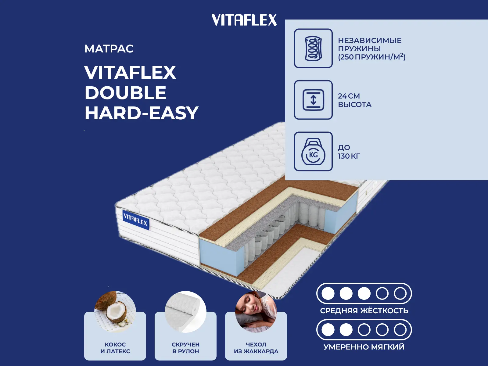 Матрас Double Hard-Easy с разной жесткостью сторон. Одна сторона – средняя, другая – умеренно-мягкая.Состав матраса: