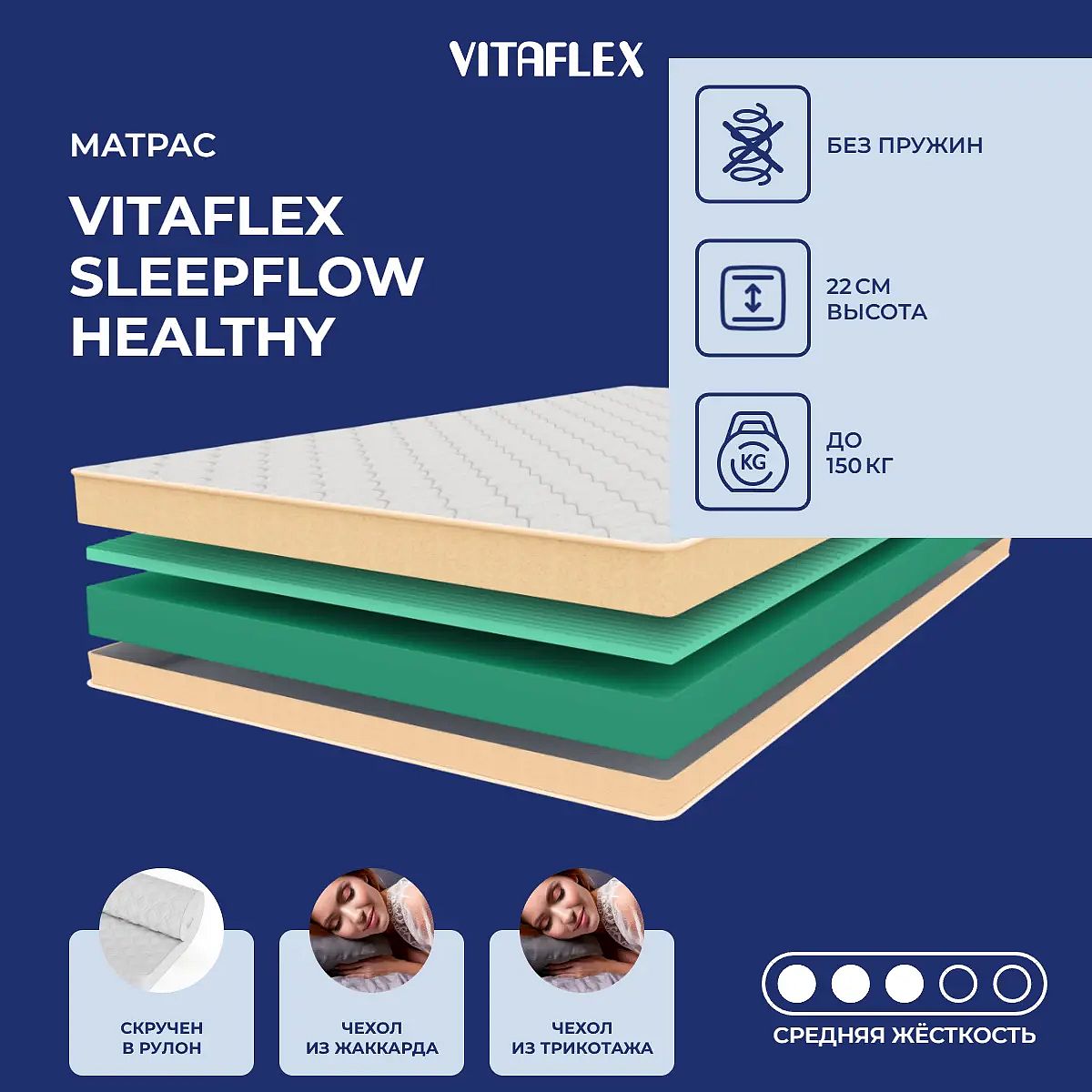 Матрас «Vitaflex SleepFlow Healthy» — средней жесткости, которая комфортна большинству людей среднего телосложения. Это — универсальный вариант и детям, и взрослым, и пожилым людям.