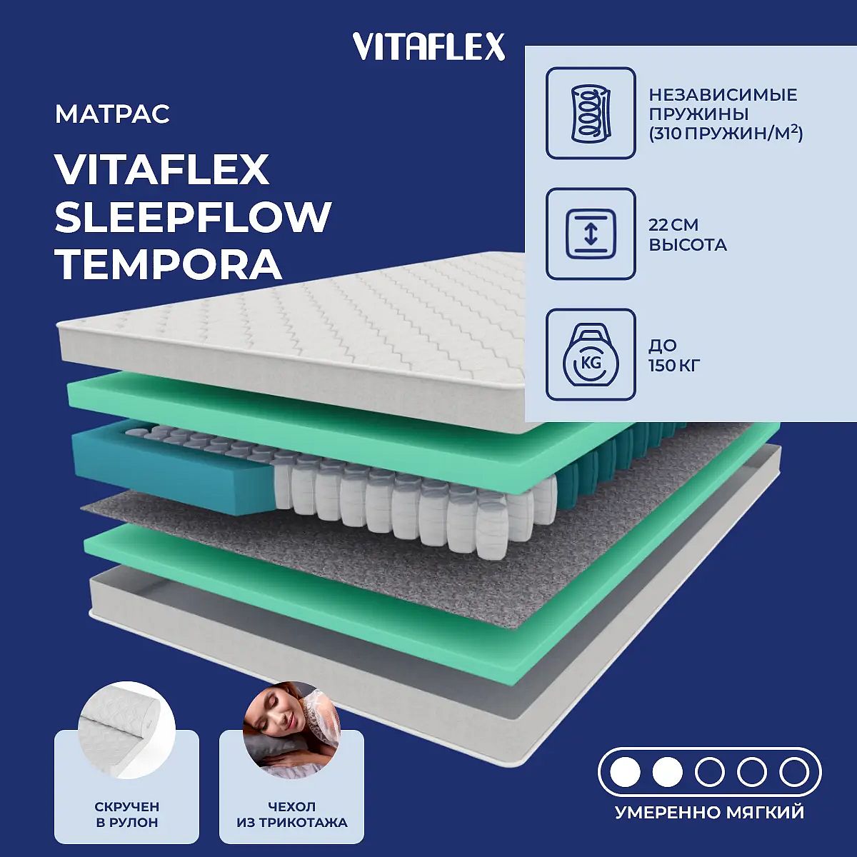 Средне-мягкий матрас «Vitaflex SleepFlow Tempora» просто создан для настоящего ценителя комфорта. Такая модель отлично подходит людям с небольшим весом.