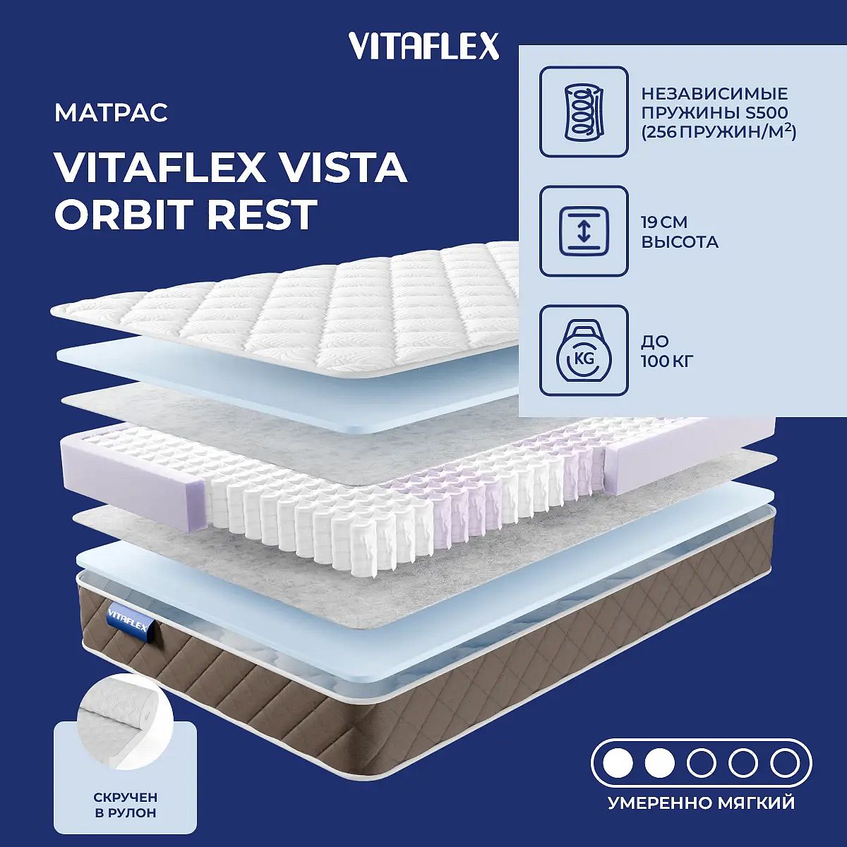 Средне-мягкий матрас «Vitaflex Vista Orbit Rest» просто создан для истинного ценителя комфорта. Такая модель хорошо подходит людям с небольшим весом.