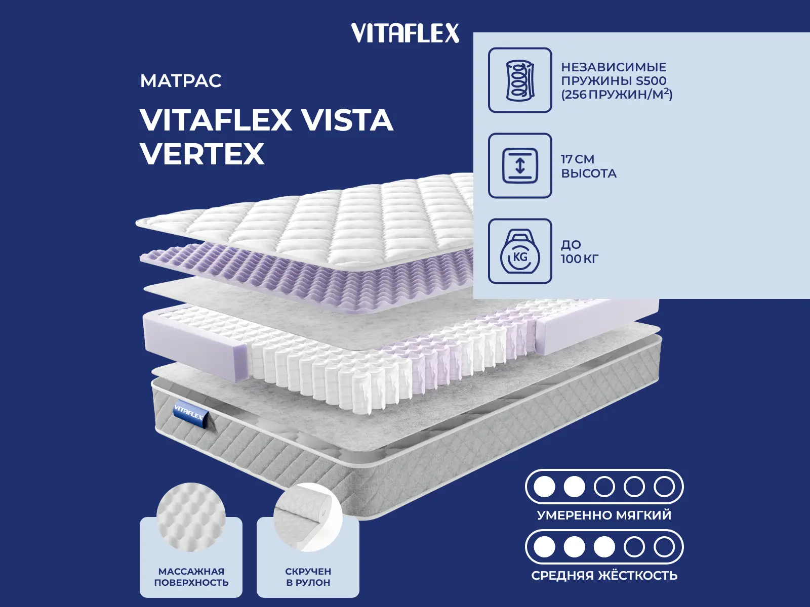 Матрас Vista Vertex имеет среднюю толщину и подходит к большинству типов кроватей.