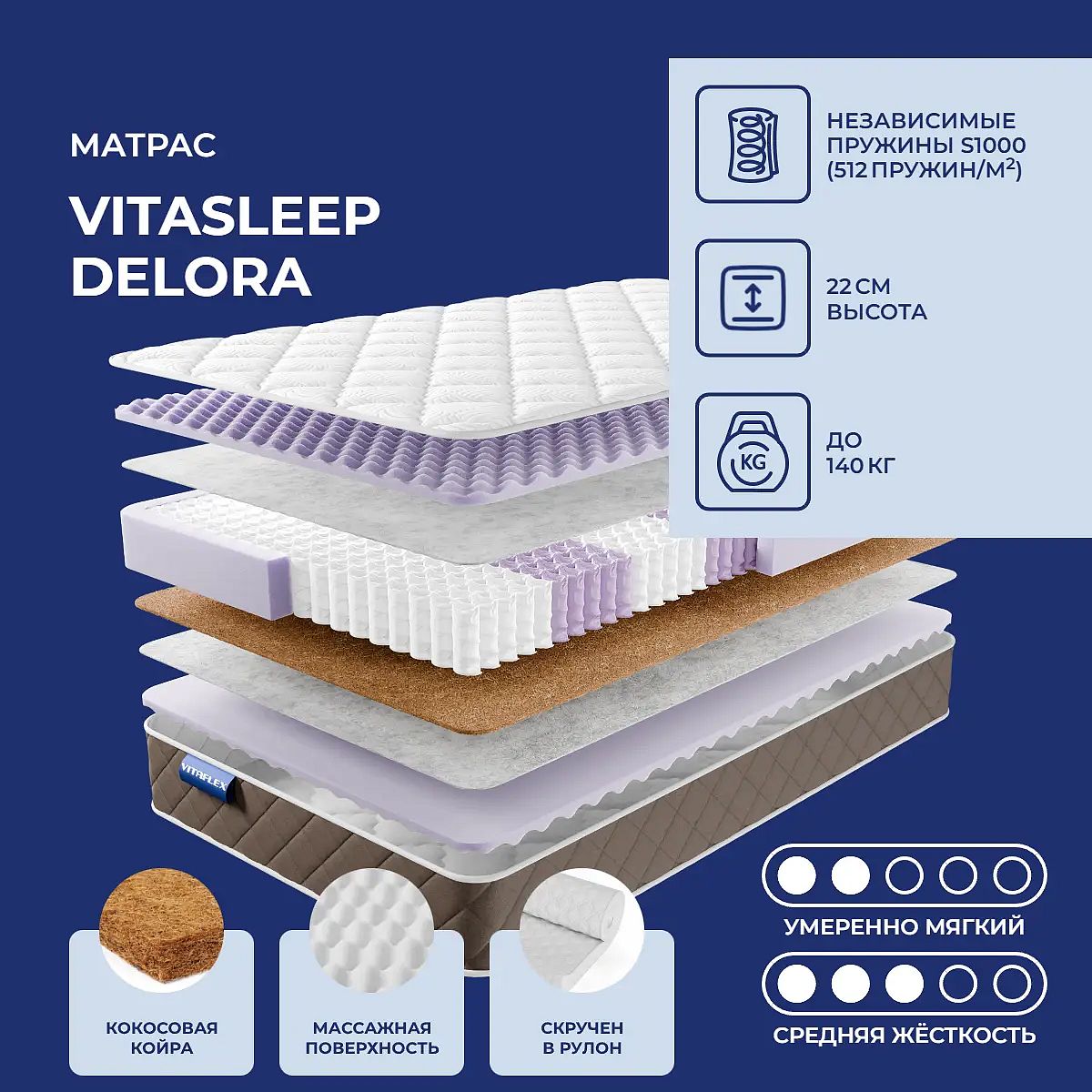Высота, см: 22. Нагрузка, кг: 140. Матрас поставляется в скрученном виде.