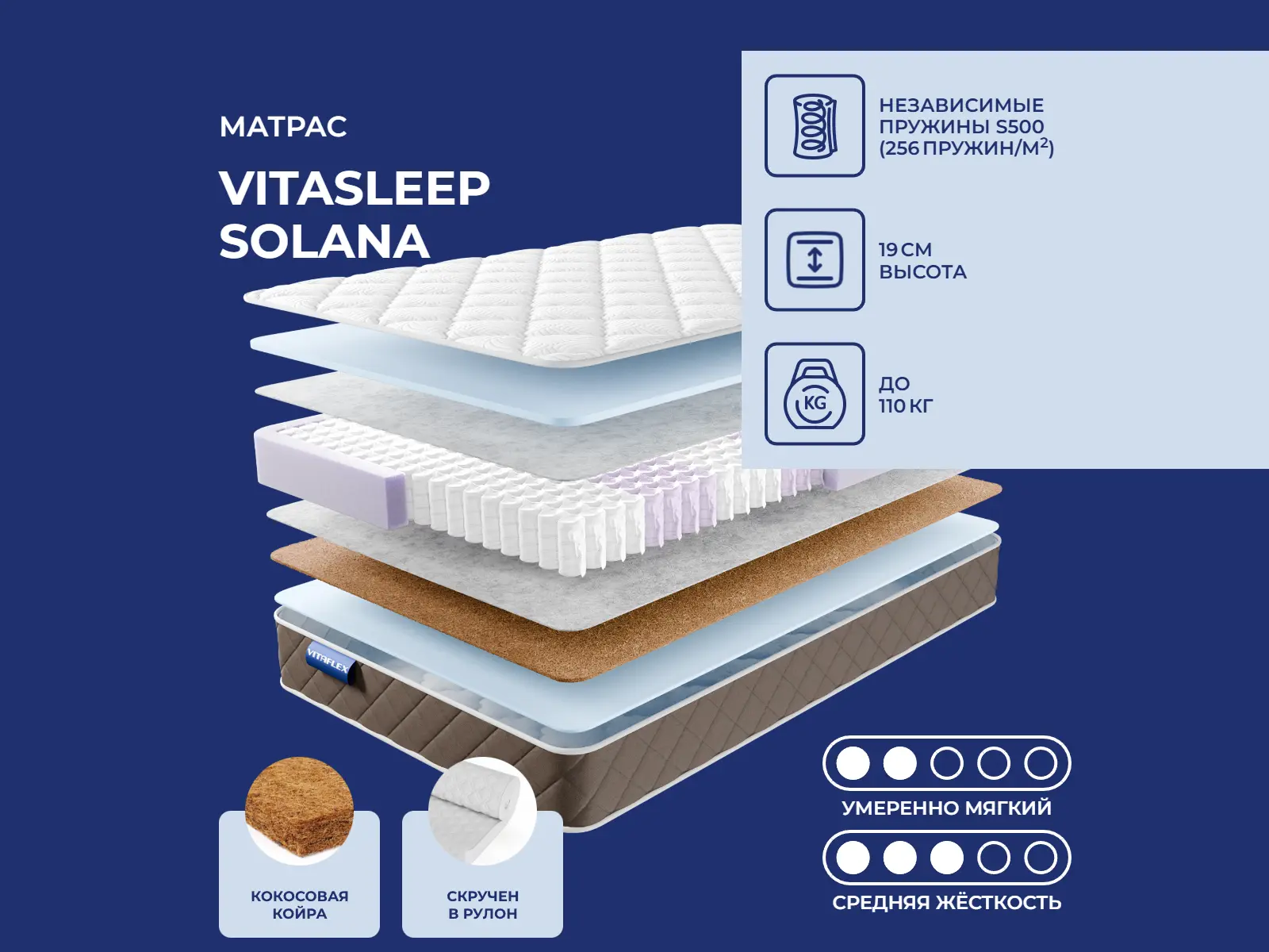 Матрас Solana рассчитан на нагрузку не более 110 кг на одно спальное место.