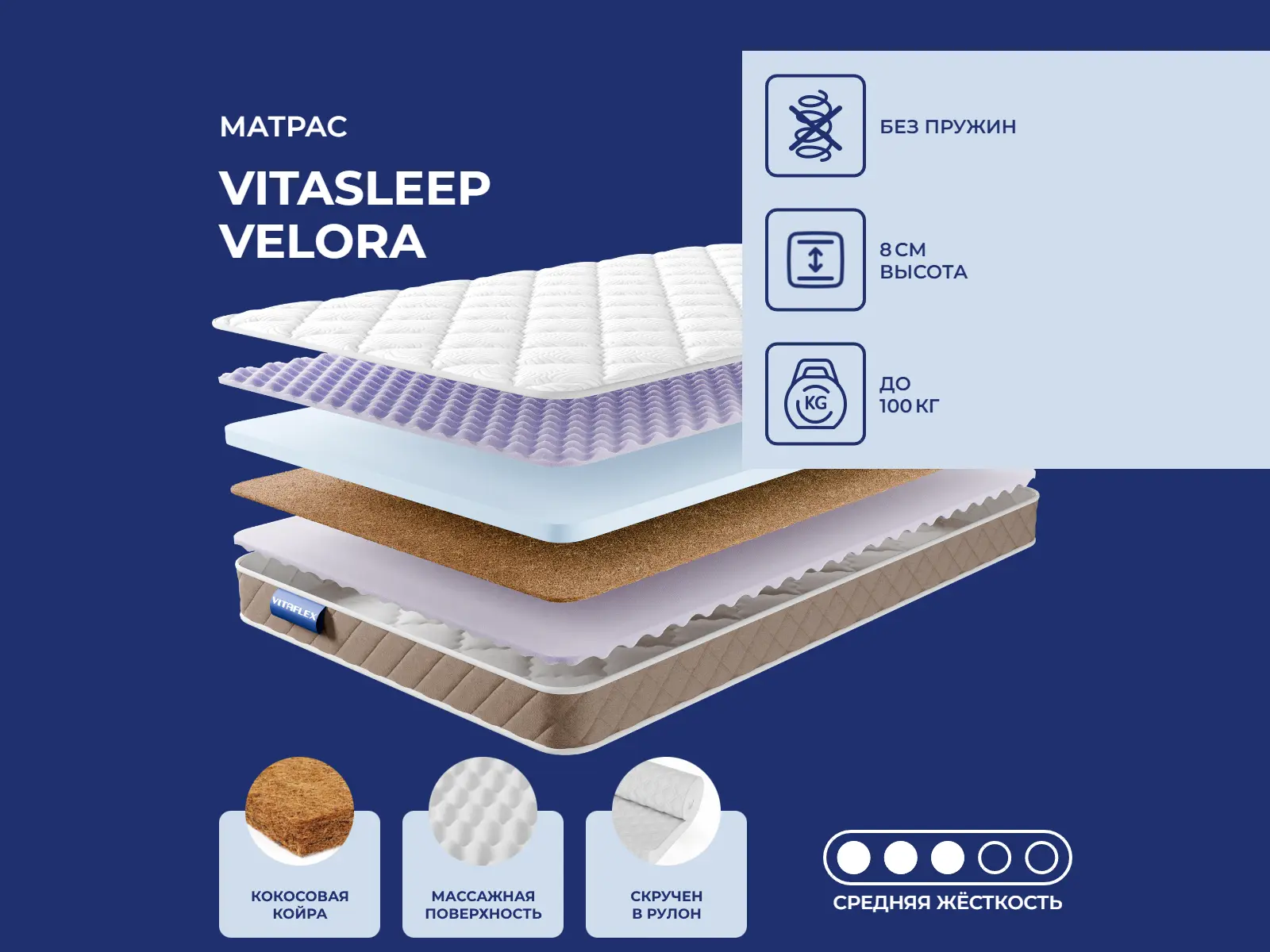 Матрас «VitaSleep Velora» — средней жесткости, которая подходит большинству людей среднего телосложения. Это — оптимальный выбор и детям, и взрослым, и пожилым людям.
