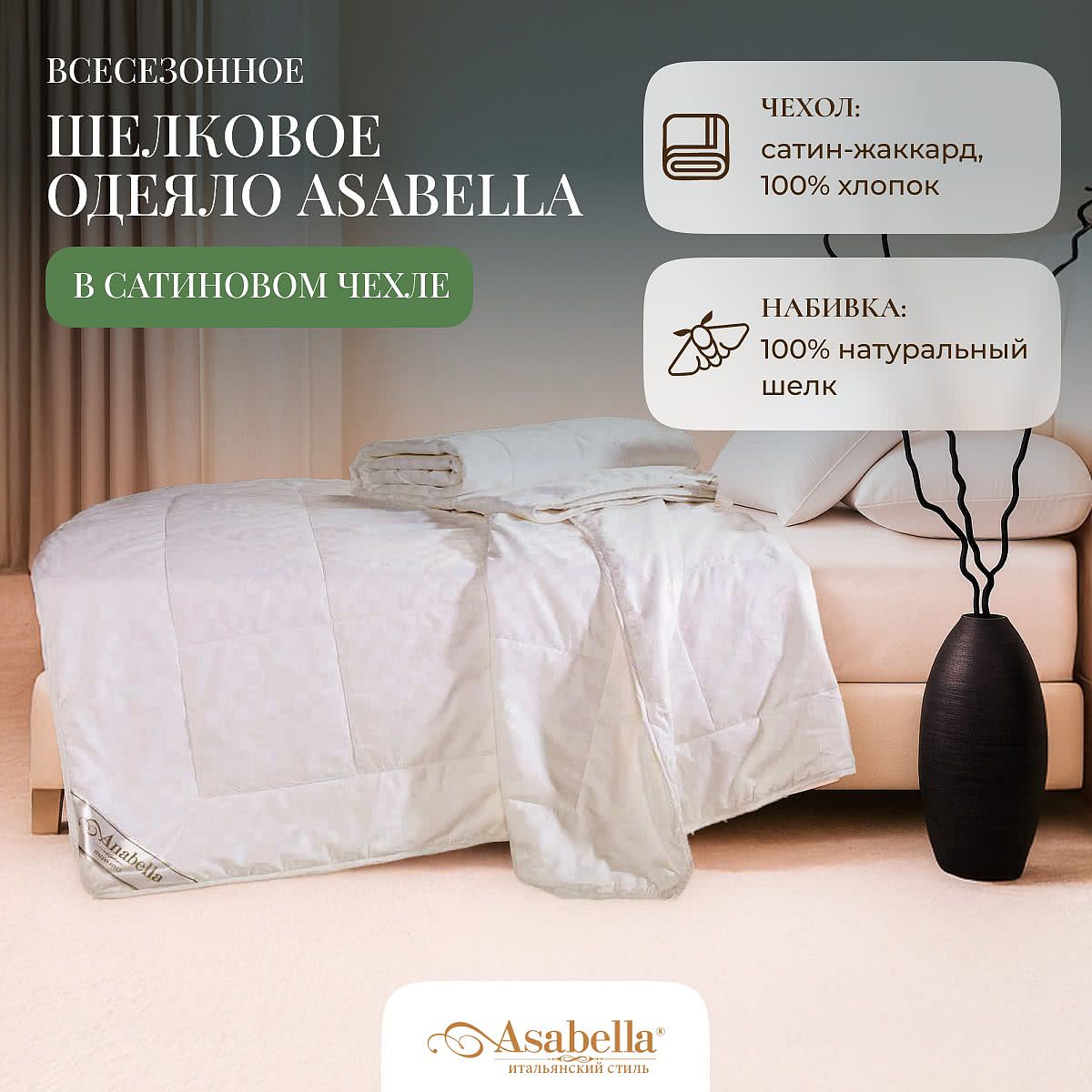Вы можете купить шелковое одеяло Asabella всесезонное в сатиновом чехле и в других размерах: 160х220 см, 145х205 см.