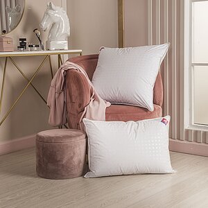 Чехол: 100% хлопок, тик, цвет - белый.Наполнитель: 90% серый гусиный пух категории "Экстра", 10% мелкое перо. Степень жесткости: средняя. Вес, г: 900. Размер, см: 70 х 70. Рекомендации по уходу: