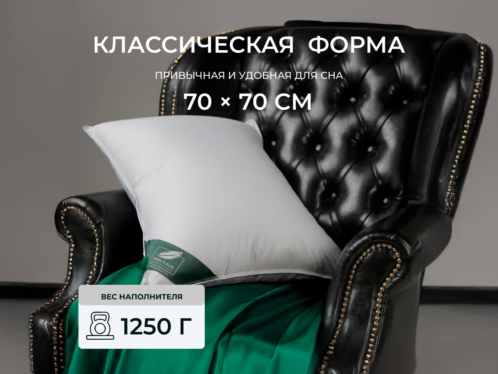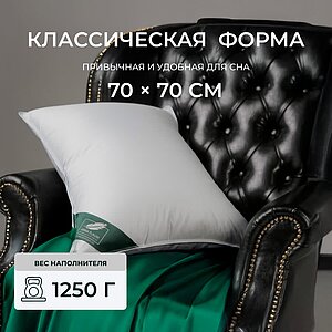 Наполнитель: внешняя камера (400 гр) – 90% пух, 10% кончики пера серого гуся; внутренняя камера – 50% пух, 50% кончики пера серого гуся. Размер, см: 70х70. Высота, см: 16. Степень комфорта: упругая, 3-х камерная. Вес, г: 1250.