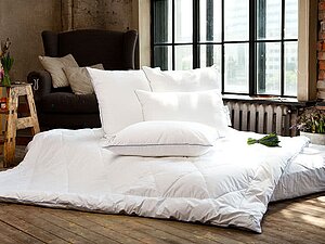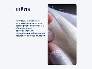 Внешний слой: 60% шёлк, 40% полиэстер; внутренний: лебяжий пух (100% полиэстер)