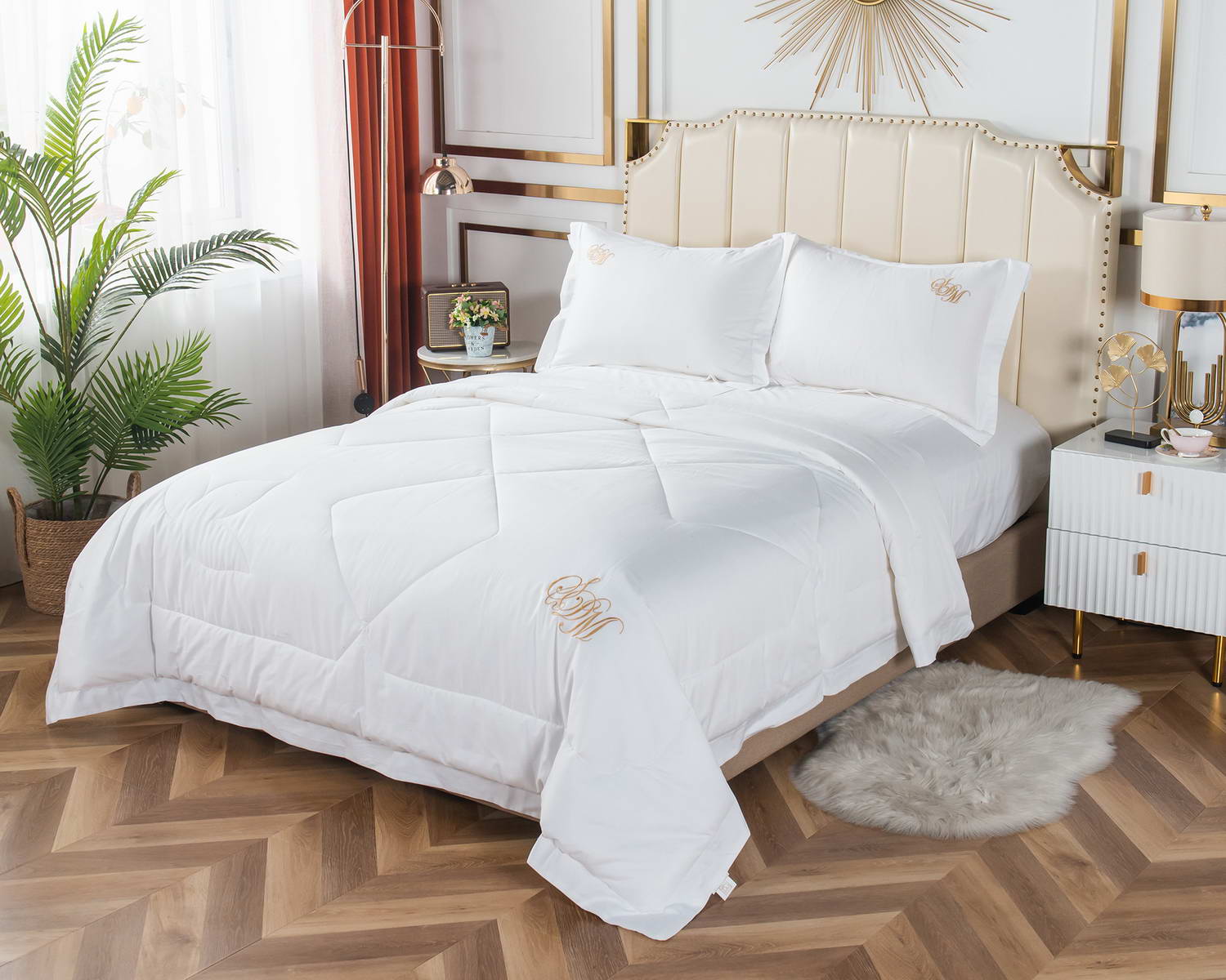 Материал наволочек и простыни: 100% хлопок (макосатин). Плотность, г/м2: 300ТС. Декор: вышивка. Уход: стирка при 30°С. Полуторный, см: одеяло 160х220, простыня 180х230, наволочка 50х70(2). Евро-стандарт, см: одеяло 200х220, простыня 230х250, наволочка 50х70(2). Семейный, см: одеяло 160х220(2), простыня 230х250, наволочка 50х70(2). Элегантные комплекты постельного белья с одеялом премиум класса из нежной, натуральной ткани макосатин Нельсон. Этот материал обладает рядом важных качеств: он прочный, но мягкий, гладкая поверхность придает постельному белью красивый внешний вид. Натуральная ткань не вызывает аллергии и раздражения, такое постельное белье приятно использовать в любое время года, и в жару, и в холод. Одеяло простеганное, легкое и воздушное, его можно стирать в стиральной машине. Благодаря микроволокну в составе наполнителя для одеяла, оно всегда принимает свою начальную форму. Постельное белье с одеялом Нельсон не только красивое, но и прочное, комплект выдерживает многочисленные стирки, не теряя при этом своей формы и ярких красок. За изделиями легко ухаживать: стирка при температуре не выше 30 градусов с минимальным отжимом. Важно хорошо просушить! При правильном уходе вещь прослужит долгие годы, не потеряв форму и цвет. Застежка наволочек: молния